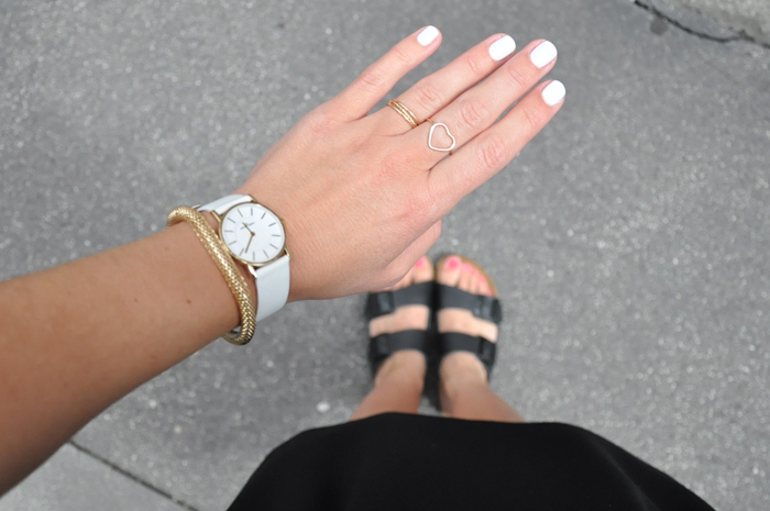 in schwarz. Das Standardmodell sozusagen. Wenn schon Challenge, dann richtig. Gelingt es mir, dieses Modell alltagstauglich zu stylen, dann gebührt mir wahrlich Rum und Ehre. Das war zumindest der Gedanke dahinter. Dass ich mir die Sache vielleicht etwas zu einfach vorgestellt hatte, durfte ich jedoch schon bald erfahren. Vor allem beim Rock stieß ich beinahe an meine Grenzen. Im Urlaub habe ich die Schuhe zu einem leichten Sommerkleid getragen und fand das eigentlich recht gut. Denn bequem sind sie auf alle Fälle und machen auch problemlos eine Sightseeing Tour mit. Vor allem ist da die Optik auch wirklich zweitrangig. Schlussendlich habe ich ein Outfit gefunden, dass mir gefallen hat. Ich mag die schwarz-weiß-Optik echt gerne, dazu meinen Lieblings-Sommerlack Essie „Blanc“ und goldene Accessoires. Die Schuhe an meinen Beinen habe ich den ganzen Tag fast nicht gespürt und ich muss sagen, je öfter ich meine „Birkis“ trage, desto lieber mag ich sie. Den Arizona Eistee „Half Iced Tea, Half Lemonade“ kann ich übrigens nicht wirklich empfehlen. Schmeckt ziemlich süß und viel zu zuckrig statt erfrischend.