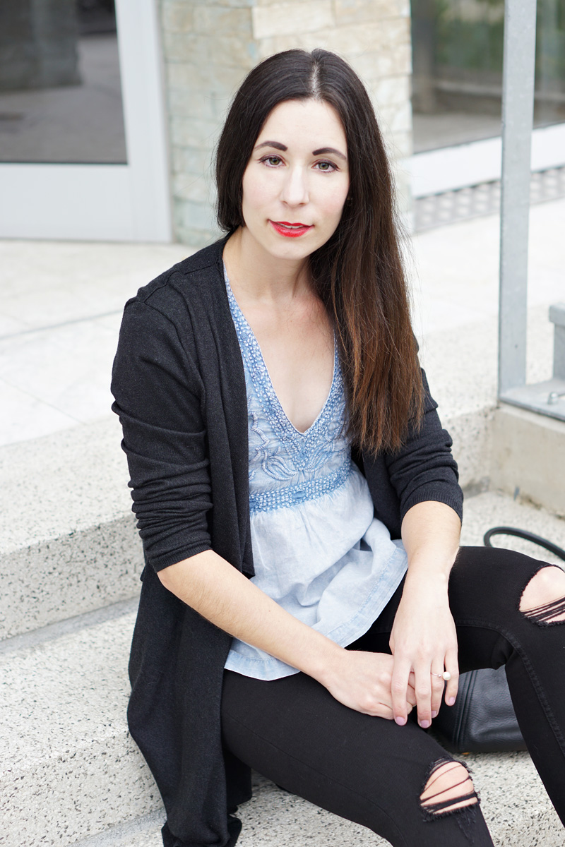 Ehrlich gesagt teile ich meine Garderobe nicht besonders gerne in Jahreszeiten ein. Selbstverständlich gibt es Kleidungsstücke, die man nur zu einer bestimmten Zeit tragen kann. Alles andere mixe ich jedoch am liebsten so gut es geht und quer durch die Bank. Leichte Tops funktionieren im Herbst ganz wunderbar unter Blazern oder Cardigans. Und selbst Blusen mit langen Ärmeln kann man im Sommer einfach aufgekrempelt tragen. Röcke trage ich im Sommer ohne und im Herbst einfach mit Strumpfhosen. Da ich sowieso fast immer bei meinem Farb-Beuteschema bleibe, habe ich eigentlich wirklich keine typische Sommer- oder Wintergarderobe. Daher war es auch gar nicht schwer, das eigentlich sommerliche Top herbstlich zu kombinieren. Und so gut es zu weiß passt, so gut passt es meiner Meinung nach auch zu schwarz oder dunkelgrau. Das macht es zum perfekten Allrounder für jede Jahreszeit. Man sieht zwar dann die hübschen Träger am Rücken nicht mehr, dafür aber die Stickerei. Jetzt hoffe ich nur, dass es nochmal richtig war wird – und bleibt – damit der Cardigan erst gar nicht aus dem Schrank muss.